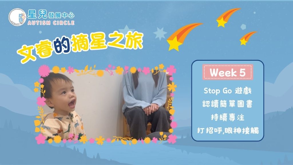 踏入第五週,文睿在語音模仿及初步表達能力建立的基礎上,開始進一步發展理解規則、參與互動及早期閱讀能力。